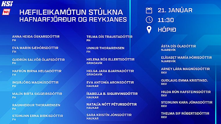 Á næstu dögum fara fram fjórar æfingar í hæfileikamótun stúlkna á höfuðborgarsvæðinu og nágrenni. Á föstudag, æfði hópur í Miðgarði í Garðabæ, á laugardag æfðu hópar í Hópinu í Grindavík og í knatthöll ÍR og síðasti hópurinn æfir á Vivaldivellinum á Seltjarnarnesi á miðvikudag.