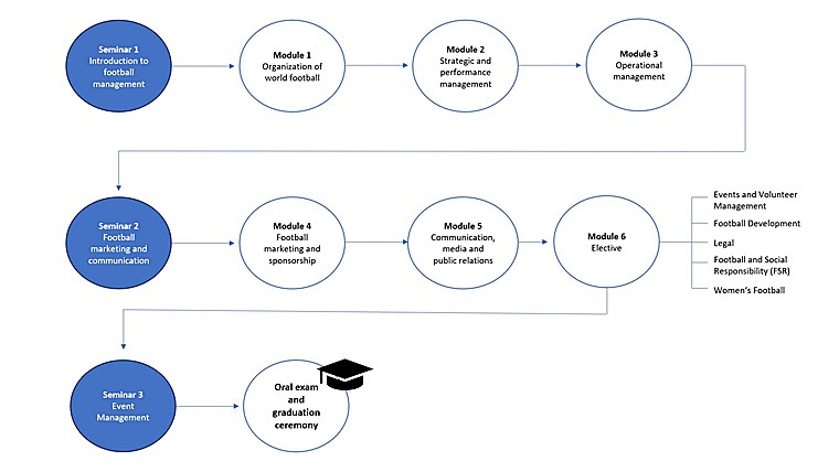 Þátttakendur geta verið allt að 30 (að hámarki 20 frá Íslandi og að hámarki 10 erlendis frá). Námið er að mestu rafrænt og fer allt fram á ensku (námsgögn, verkefni og fyrirlestrar). Rafræni hlutinn (e-learning) er í 10 lotum (modules), 5 lotur sem allir taka og 5 lotur þar sem þátttakendur velja sér eitt viðfangsefni. Haldnar verða 3 vinnustofur, tvær í höfuðstöðvum KSÍ (24.-25. janúar 2024 og 29.-30. október 2024) og ein rafræn (29.-30. maí 2024). Kennarar og fyrirlesarar eru tilnefndir af UEFA/IDHEAP og hafa þau öll mikla reynslu af því að starfa í alþjóðlegu umhverfi knattspyrnuhreyfingarinnar – hjá knattspyrnusamböndum, knattspyrnufélögum og fyrirtækjum eða stofnunum með sterka tengingu við knattspyrnu. Náminu lýkur með útskrift í október 2024 að undangengnum skilum á tveimur skriflegum verkefnum og munnlegu lokaprófi.