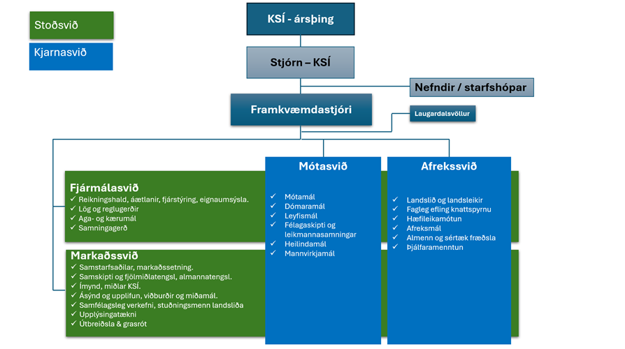 Síðustu mánuði hefur verið unnið að skipurits- og skipulagsbreytingum á skrifstofu KSÍ og hafa þær breytingar nú verið innleiddar. Á meðal helstu breytinga má nefna sameiningu sviða/deilda og ný heiti sviða auk tilfærslu verkefna.